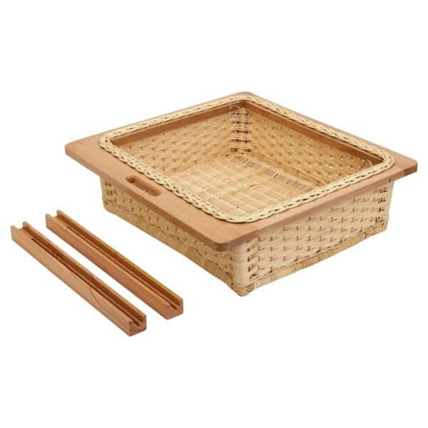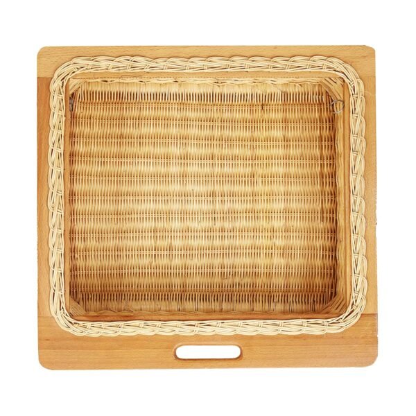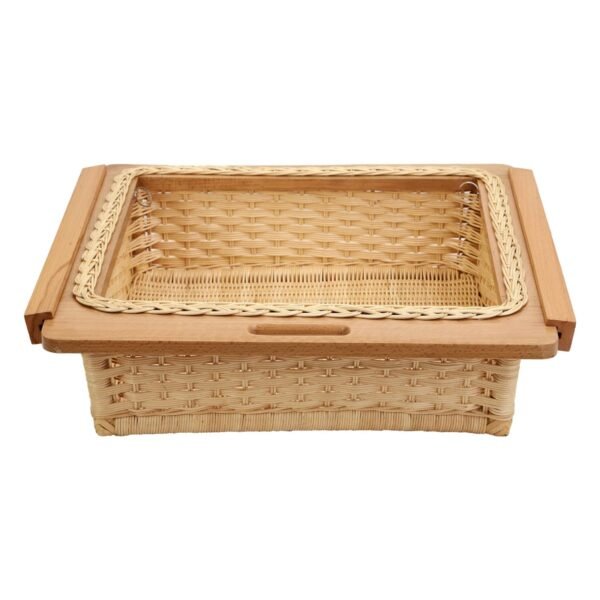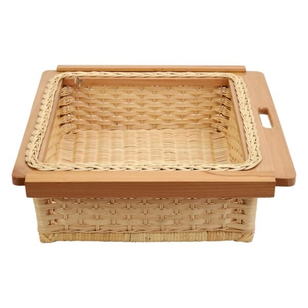 The stander size basket features a width of 16 inches, height of 8 inches, and depth of 20 inches, making it suitable for various food storage needs. The wicker basket is designed for use in modular kitchens, with a wooden frame and integrated handle molding for easy handling and transportation.