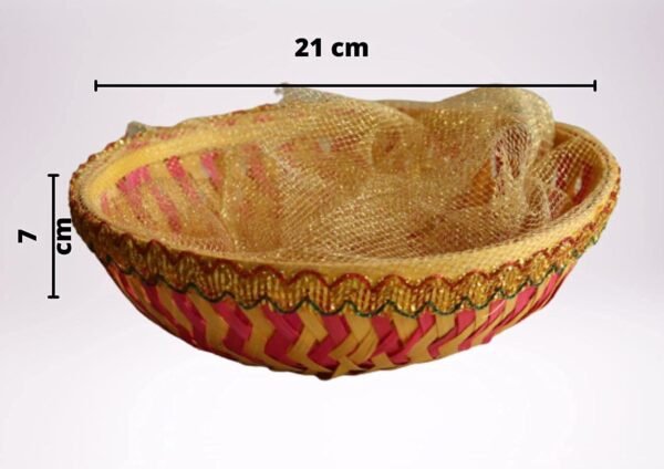 Elevate your wedding or festival decor with these handmade, colourful net covering round shape bamboo baskets. Crafted with intricate detailing, these baskets are perfect for wedding hamper packaging or as festive centrepieces. The vibrant yellow hue adds a cheerful touch to any celebration. This set of 4 baskets offers versatility in creating stunning displays. With their sturdy bamboo construction, these baskets are both practical and visually appealing. Embrace the artistry of handmade craftsmanship and add a touch of elegance to your special occasions. Material :: Pure Bamboo With Net Cover Color: multicolour Size:: 21x21x7:: This Is 9 inch Basket :: Please Check The Size Carefully Before Order The Product For Better Experience HANDMADE & NATURAL::-This Is A Handmade eco-friendly natural Net Covering Pure Bamboo Basket . This Basket Have Every piece Are hand finished. It’s easy to carry And light weight to use. USES ::- Presenting your fantastic gift, Dry Fruit Packaging, Chocolate Packaging, Wedding And Festival Gift Packaging etc .:: Add A Natural And Village Look To Your Home